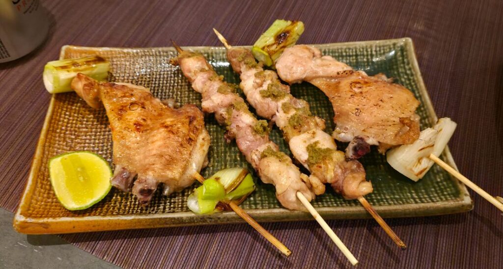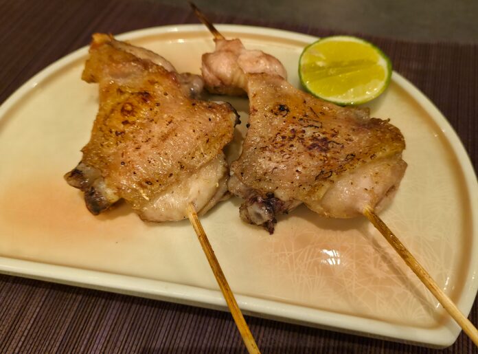 続いて,また焼き鳥だが,手羽先にネギ,と柚子胡椒が載った焼き鳥。これはうまい。柚子胡椒なかなかやるなって感じ。これはリピありだ。ちなみに注文時に塩かタレかをきかれなかった。ここは標準で塩となる模様。これで良し。
