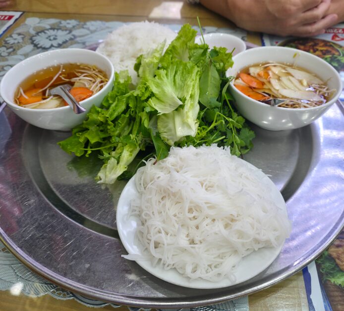 実は,席について初めに出てきたのは,上の写真のもの。白いのは米粉めん。日本では結構な数の米粉めんを試しているが全部乾麺。これは,毎日作るという手作り生麺。