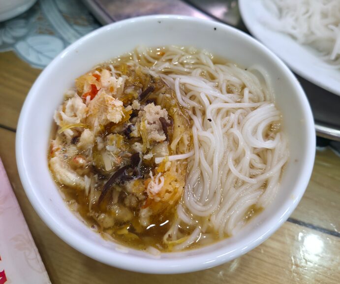 かに春巻きは,実はこんな風にして,米粉めんと一緒に出てきたスープに浸して食べる方法もある。味変って感じか。これはこれでうまい。スープがなんとも表現しがたい味だが,さっぱり系の味。米粉めんは,このかに春巻きを浸して食べた後にシメで食べるのだと。触感はそうめん。味はまったく別ジャンルのさっぱり系ラーメンって感じでおいしい。この生米粉めんは,フォーを含め,今まで食べた米粉めんの中でも最高峰。もう一度食べたい。