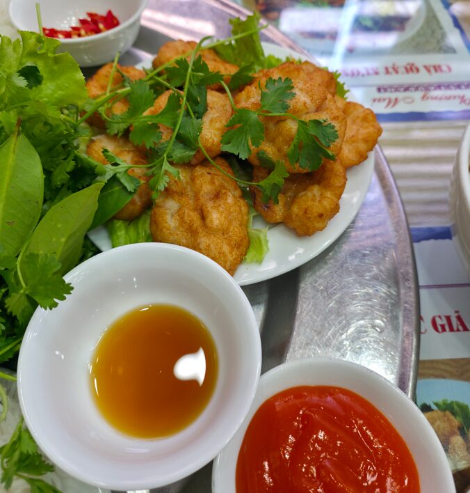 これは,イカのさつま揚げみたいなもの。さっぱり系のタレと甘辛のタレにつけて。