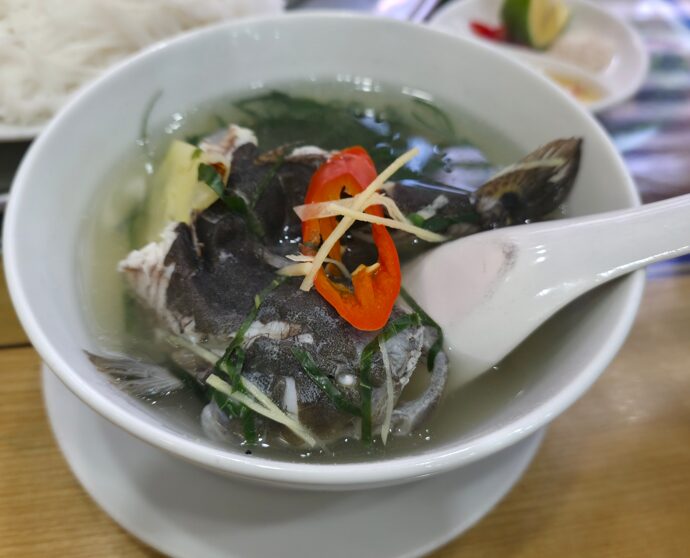 実はコレ,始めの方にでてきた魚のスープ。これまで,なんどかお目見えしているが,いつも子魚が一匹丸ごと入っている。スープはパクチー系の香味がするやさしいスープ。魚の味はしなかったが,これは4毒が入っていない。