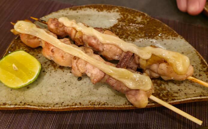 つづいて,チーズが載っている焼き鳥。チーズはダメだが,同僚選択の一品。チーズがない方がよかったって感じ。日本のチーズとは違う。ガムのようなチーズw